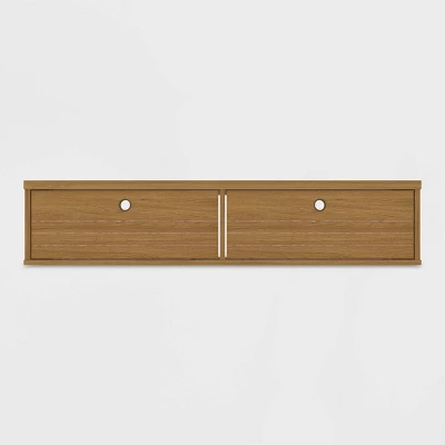 Seamless, functional, and a bit industrial chic, the Liberty floating entertainment center makes entertainment easy and stylish. Two concealed drop-down shelves perfect for tucking away media accessories, books, DVD players, and more. This piece is both practical for a smaller or larger space, with clean lines, display space, and smart design.